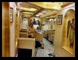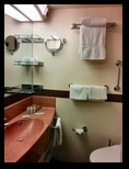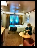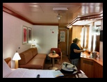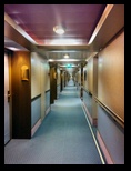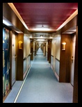 Los pasillos de acceso a los camarotes son inmensos, se pierde la vista en uno y en otro sentido. Nuestro camarote tiene una zona de estar, con un sofá de tres plazas y su mesa, una parte de escritorio enfrente, donde también está la televisión vía satélite y algunas emisoras de información interior, incluso con función de ordenador, pudiéndose realizar desde reservas de excursiones, consultar el estado del buque, ver webcam, o consultar los gastos realizados en el barco. También la zona de noche es generosa, con cama de 1,80 m de ancha, ventana al exterior, moqueta perfectamente limpia, frigorífico, etc. El baño es suficiente, bien distribuido, frente al que están varios armarios, la caja fuerte, los chalecos salva vidas, etc.