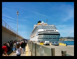 Poco más de las 7 de la mañana ya estamos desayunando, abundante fruta, zumos y algo de bacón y café nos preparan para el largo día. La vida del turista es dura! A las 8 ya podemos desembarcar en Ibiza, la primera escala de este crucero. Los autobuses esperan a pie del buque y por orden de tipo de excursión, salimos por la cubierta tercera donde nos esperan los guías que nos acompañaran. Los sistemas de seguridad son constantes, nos leen las tarjetas identificativas, pasamos escáner, no se permite introducir comidas desde el exterior, así como elementos peligrosos, etc.