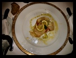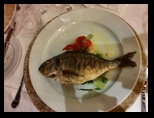 En esta cena se puede observar en las fotografías platos como “Pez espada en rodajas con ensalada”, “Crema de crustáceos”,