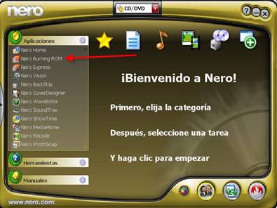 Lo primero es abrir el NERO y picar sobre donde indica la flecha: