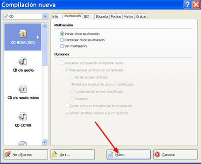 Hay que comprobar que todos los parámetros estan bien, como marcada la opción CD arriba a la izada. O marcada la opción CD-ROM (ISO). Se selecciona “NUEVO” y nos aparece: