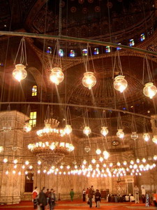 En el interior de esta mezquita resaltan las contrastantes ondulaciones del alabastro que recubre todo, el suelo totalmente alfombrado predominando el color rojo, las altas cúpulas ricamente decoradas y las enormes lámparas concéntricas que nos recuerdan el interior de la de Santa Sofía en Estambul.