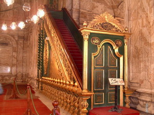 Con los zapatos en unas bolsas, y sintiendo el frío en nuestros pies del mármol situado bajo las alfombras, recorremos la gran mezquita, su altar, sus capillas y su púlpito al que se accede por una suntuosa escalera recubierta de rojizas alfombras y con artística balaustrada dorada.