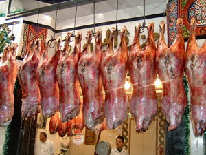 recién sacrificados corderos, colgados en las fachadas como si de una macabra